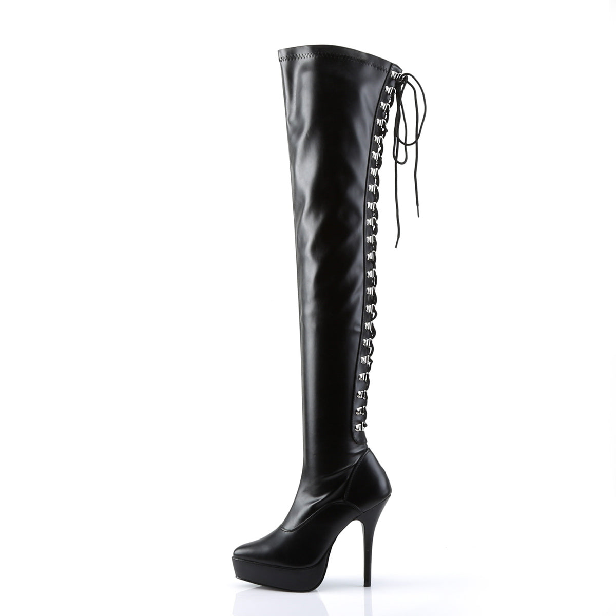 | Description | 5 1/4 "" (13.3cm) tacco, 1 1/4 "" "(3,2 cm) piattaforma ritorta in pizzo Stivaletto per coscia, chiusura a zip laterale interna |