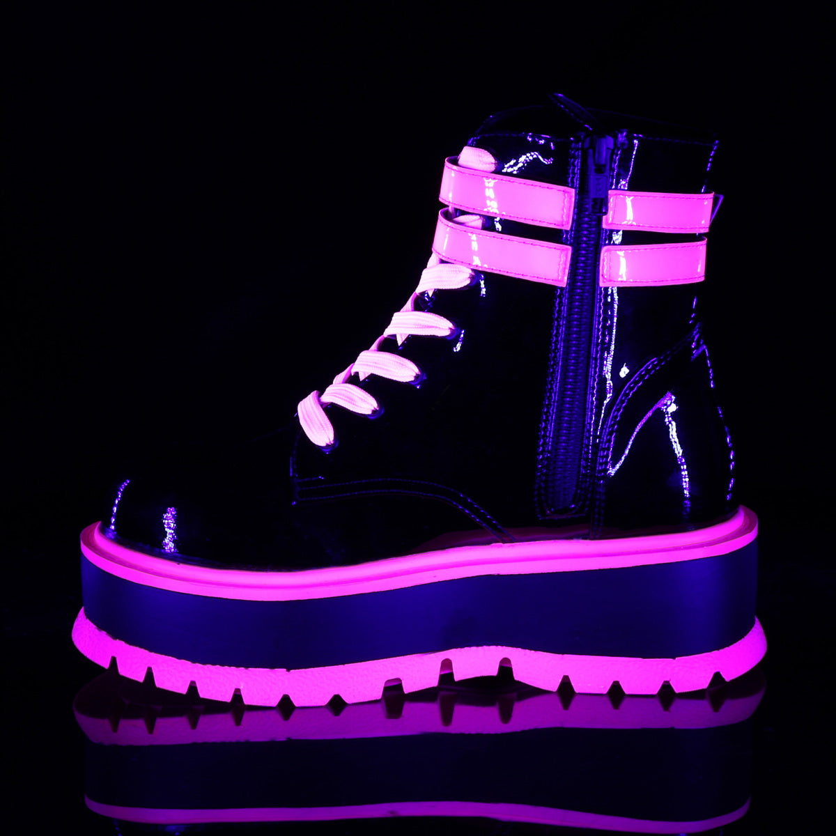 DemoniaCult Womens Ankle Boots SLACKER-52 Blk Pat-UV Iridescent Pink