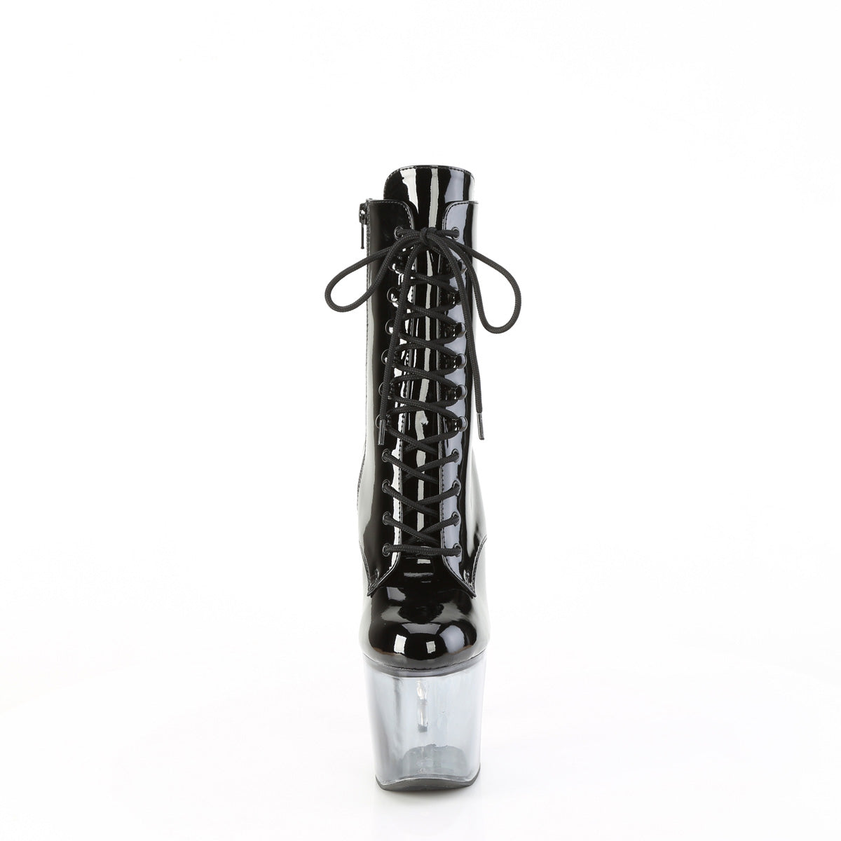| Additional Description | 7"" (178mm) Stacked Heel, 2 3/4"" (70mm) Platform Lace-Up Front Ankle Boot Featuring Black/Clear Ombre Platform Bottom |